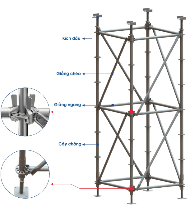 Hệ giàn giáo Ringlock giúp thăng bằng nhờ các mối liên kết chặt chẽ với nhau, tải trọng lớn hơn rất nhiều so với giàn giáo nêm và giàn giáo khung.